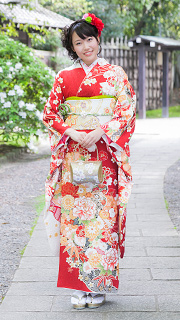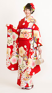 朱赤ベースに大きな白い梅の花、カラフルな鞠が可愛らしい着物です。可愛らしい雰囲気な貴方にピッタリです。お姉さまの結婚式やお友達の結婚式にオススメです。
