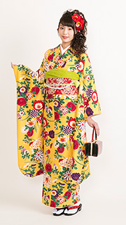 山吹色の地に赤・白・紫の色とりどりの菊の花とグリーンが鮮やかな葉をあしらったモダンレトロの逸品です。結婚式に華やかな色を添えるのにピッタリな着物です。
