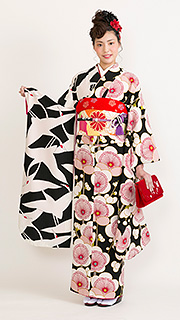 エレガントな黒にお祝いの鶴、可愛らしいピンクの梅柄で左右違う柄をあしらったスタイリッシュな着物です。インパクトを求める個性的な装いがお好きな貴方にオススメです。