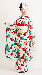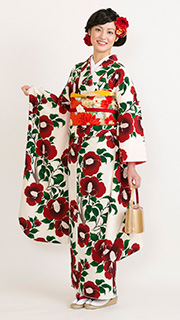 白地に真紅の椿と緑の葉が大胆な着物です。凛とした優美な柄と色合いで貴方をさらに引き立ててくれること間違いなし。椿の花言葉は、『謙虚な美』です。