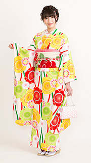 白地に赤・黄・黄緑の大きな梅柄がインパクト大です。赤と緑のよろけのラインが入った個性的でモダンな着物が貴方を引き立ててくれること間違いなし!