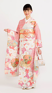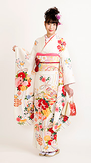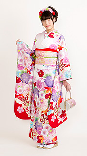 白地に大きな菊や桜、蝶をあしらった可愛らしい逸品です。ピンクや赤、紫など可愛らしい色使いでガーリーに仕上がります。お友達の結婚式にピッタリです。