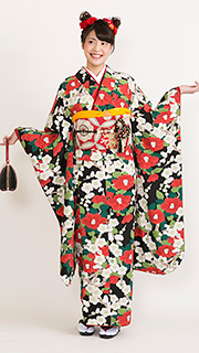 黒地に白い梅と赤い椿が咲き乱れ、差し色のグリーンの葉が華やかでレトロな着物です。ハウス・レストランウェディングと幅広くご利用いただけます。