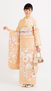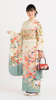 クリーム地に色を抑えた草花を配して、優しい雰囲気をかもしだす京友禅です。手書きで仕上げたエレガントさが着る人の内面の美しさを引き出してくれます。