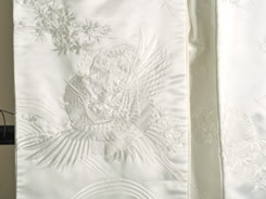 繻子の生地に花車が豪華にデザインされ、その上を御目出度い鶴が舞います。